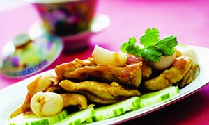 3) Serve chicken lychee in a plate lined with sliced cucumber. |